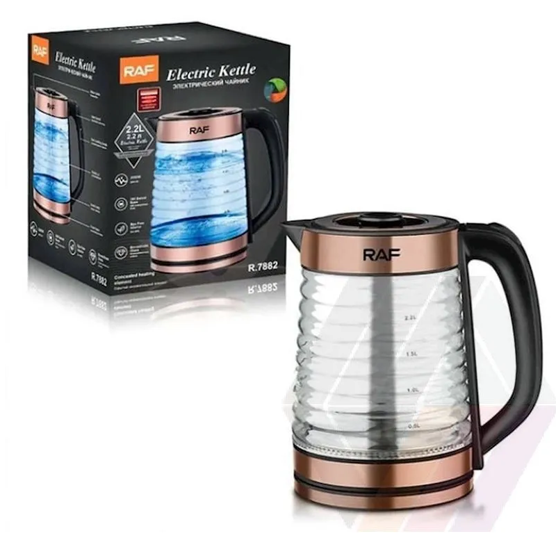 - Ce produit est décrit par une variété de caractéristiques, à savoir: Fabricant bouilloire RAF, Capacité bouilloire 2.2 L, Puissance bouilloire 2200 W, Couleur bouilloire Noir, Garantie bouilloire 1 an,
