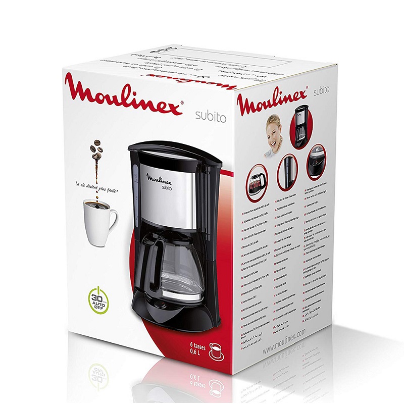 - Ce produit est décrit par une variété de caractéristiques, à savoir: Fabricant cafetière Moulinex, Capacité de réservoir cafe 0.6 L, Puissance cafetière 650 W, Type de cafetière Filtre, Nombre de tasses cafe 6 Tasses, Couleur cafetière Noir & Inox, Garantie cafetière 1 an,