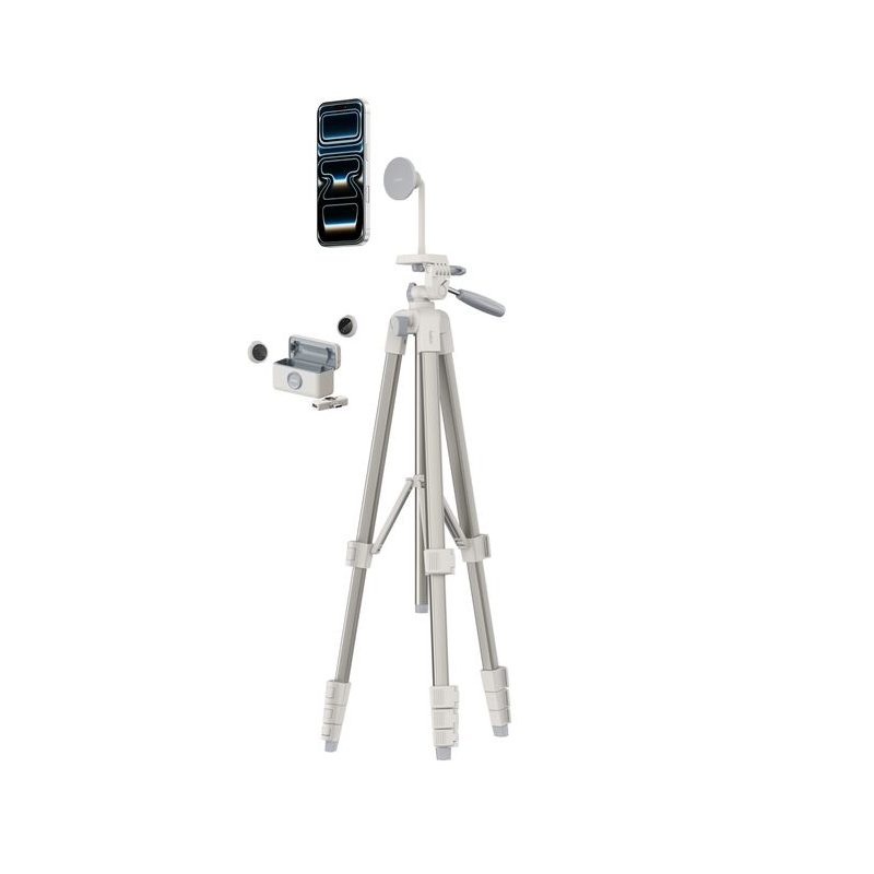 – Kit complet d’accessoires de création de contenus numériques avec un trépied en aluminium, un support aimanté pour téléphone et une paire d’écouteurs sans fil