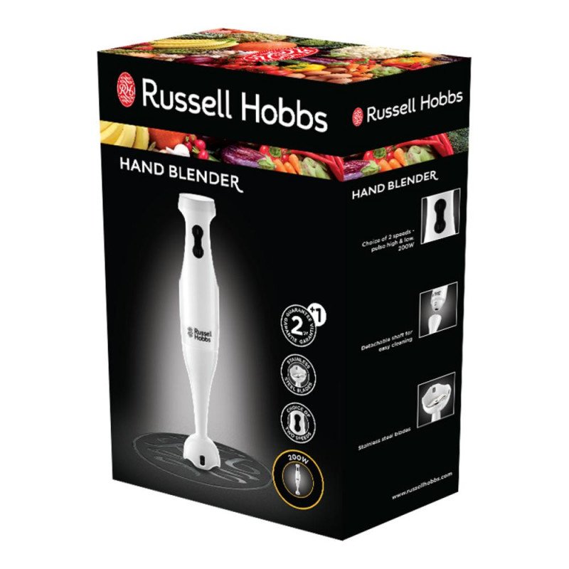- Ce produit est décrit par une variété de caractéristiques, à savoir: Fabricant mixeur Russell Hobbs, Puissance mixeur 200 W, Nombre de vitesses mixeur 2 Vitesses, Couleur mixeur Blanc, Garantie mixeur 1 an,